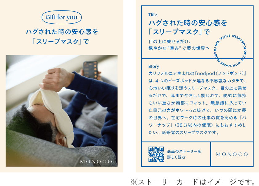 商品が持つ「ストーリー」と会社の「想い」を重ねるストーリーカード。QRコードを読み込めば、商品の詳しい説明が読めます(価格は非表示ですのでご安心ください)。